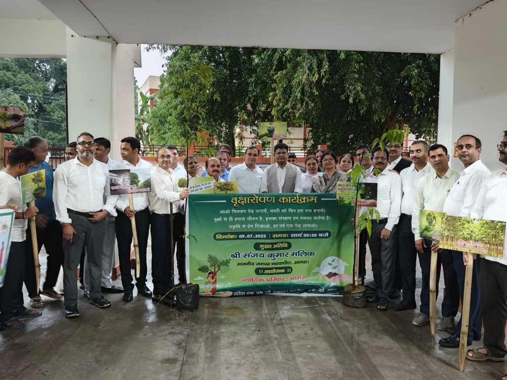 _*कार्यालय, जिला विधिक सेवा प्राधिकरण, आगरा।*_ _~*प्रेस विज्ञप्ति_*“`माननीय उच्च न्यायालय इलाहाबाद के निर्देशन में एवं माननीय जनपद न्यायाधीश/अध्यक्ष, जिला विधिक सेवा प्राधिकरण, आगरा श्री संजय कुमार मलिक महोदय के मार्ग दर्शन में आज दिनांक 09.07.2025 को अपर जिला जज/सचिव, जिला विधिक सेवा प्राधिकरण, आगरा डॉ दिव्यानंद द्विवेदी एवं न्यायिक अधिकारी गण के द्वारा न्यायिक आवास परिसर में *एक वृक्ष मां के नाम* थीम पर वन विभाग के सहयोग से वृक्षारोपण कार्यक्रम का आयोजन किया गया। वृक्षारोपण कार्यक्रम के समय माननीय जनपद न्यायाधीश एवं भू-अर्जन पुनर्वासन और पुनर्व्यवस्थापन प्राधिकरण , आगरा के माननीय पीठासीन अधिकारी श्री महेश नौटियाल, मोटर दुर्घटना दावा अधिकरण के पीठासीन अधिकारी श्री नरेंद्र कुमार पांडे, परिवार न्यायालय के प्रधान न्यायाधीश, माननीय श्रीमती तृप्ता चौधरी, अपर जिला जज प्रथम, श्री राजेंद्र प्रसाद, अपर जिला जज, श्री अमरजीत, मुख्य न्यायिक मजिस्ट्रेट, श्री मृत्युंजय श्रीवास्तव एवं समस्त न्यायिक अधिकारीगण एवं कर्मचारीगण उपस्थित रहे । (डॉ दिव्यानंद द्विवेदी) अपर जिला जज/सचिव जिला विधिक सेवा प्राधिकरण, आगरा।